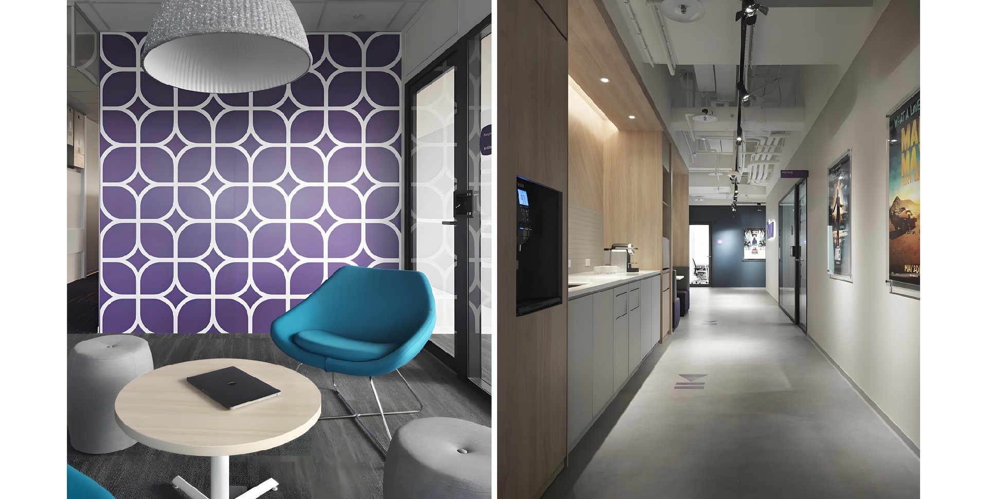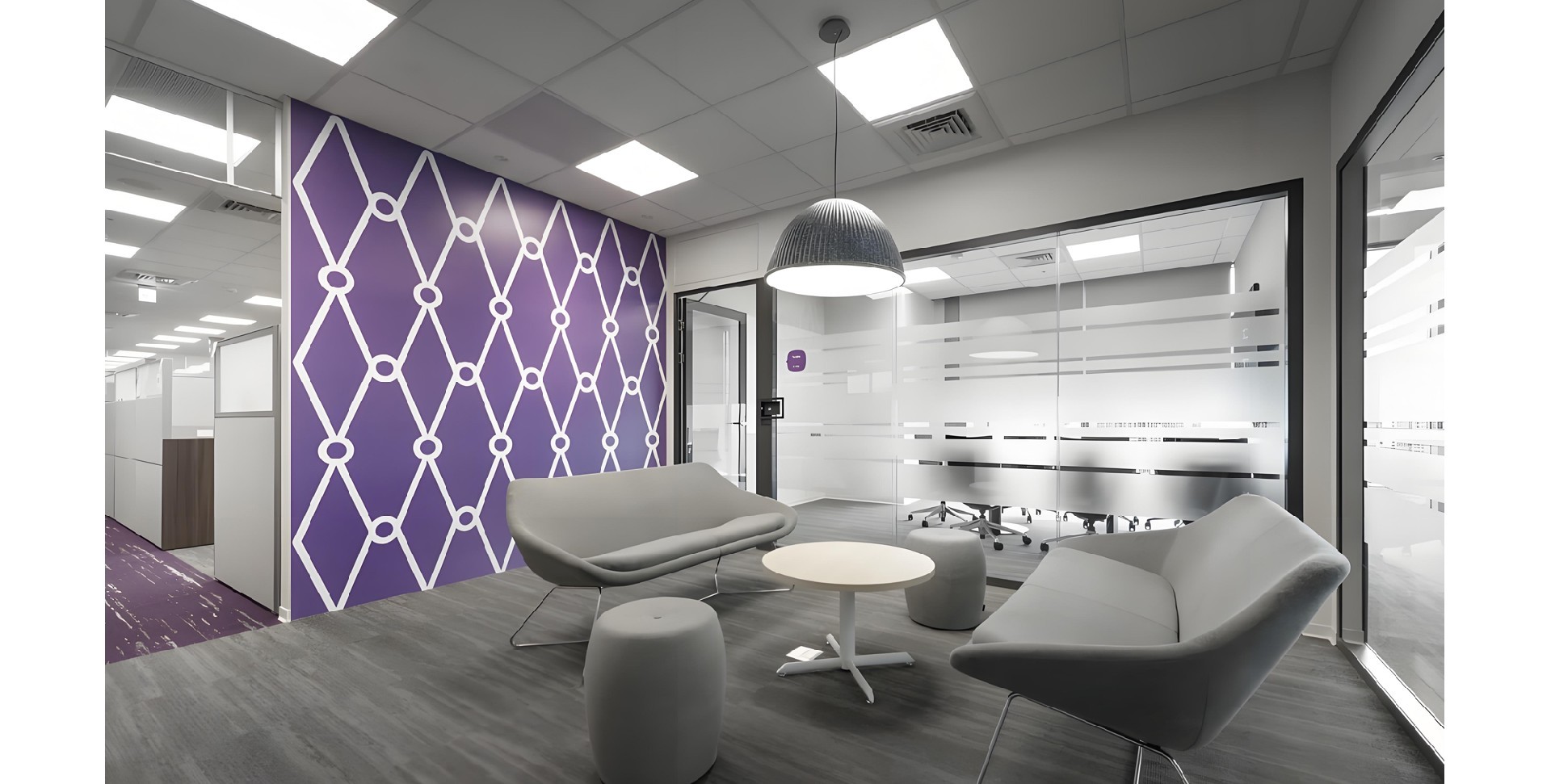 觀為監(jiān)測(cè)辦公室設(shè)計(jì)通過簡(jiǎn)約的線條和色彩搭配,運(yùn)用抽象圖案和鮮艷色彩,以紫色和白色為主,搭配灰色和木質(zhì)元素。通過自然元素的引入和幾何設(shè)計(jì)的結(jié)合,創(chuàng)造出一個(gè)舒適且富有層次的室內(nèi)環(huán)境。