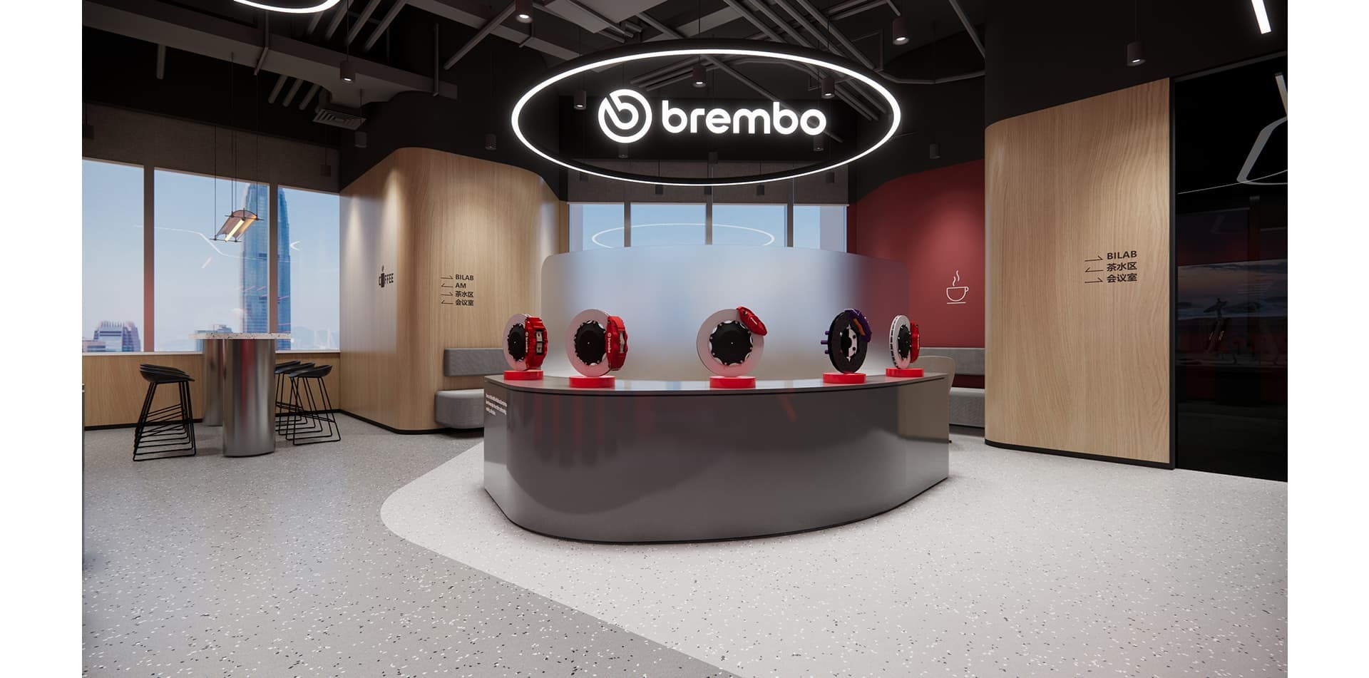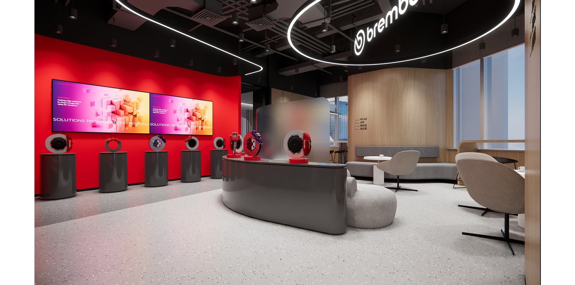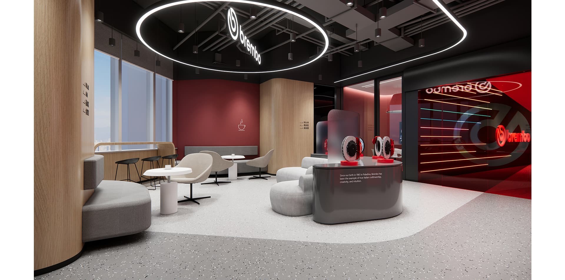 The decoration of Brembo's office highlights elements of industrial style, with the corporate red and white logo colors as the main tone, incorporating some green elements to make the corporate...