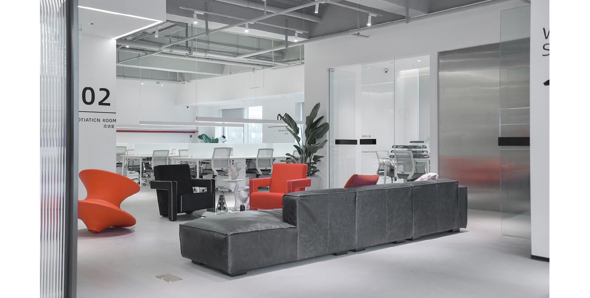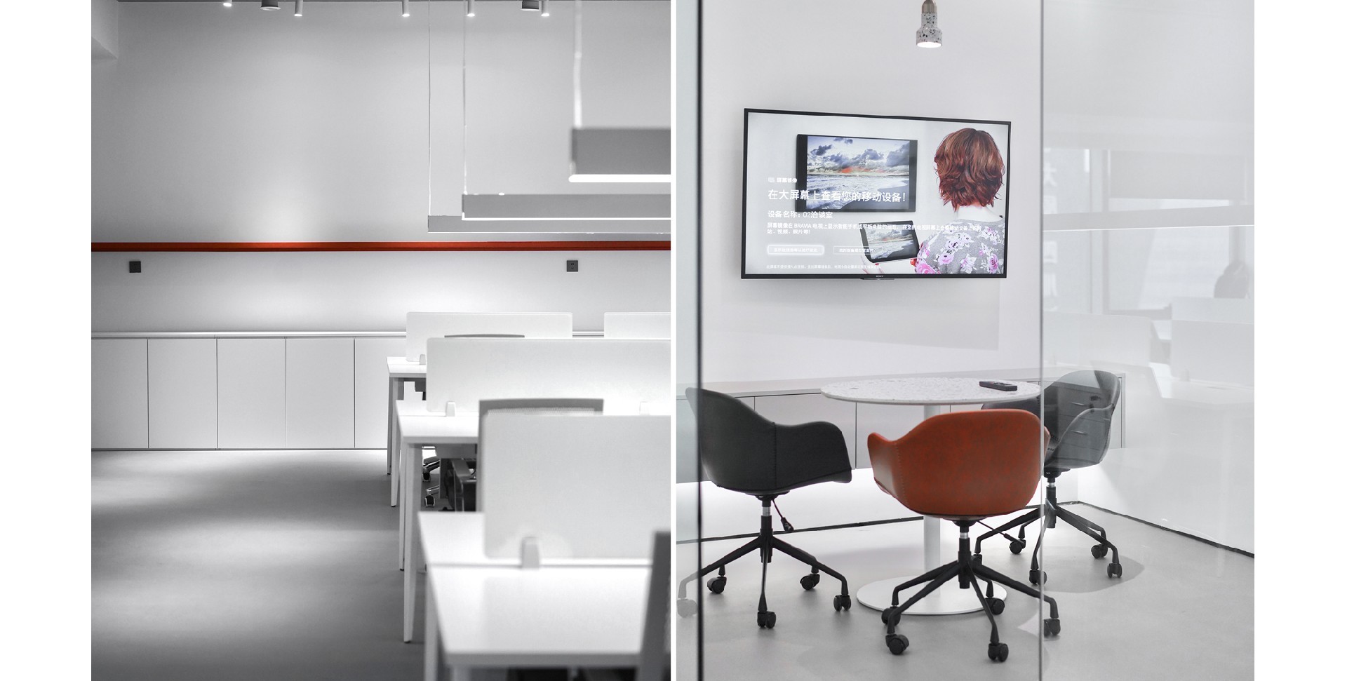 辦公室以白色和紅色為主色調(diào),營造出簡潔而時(shí)尚的氛圍。整體布局寬敞,光線充足,展現(xiàn)了現(xiàn)代辦公環(huán)境的開放性和舒適性。強(qiáng)調(diào)空間的通透性和自然光的利用。為員工創(chuàng)造一個(gè)明亮、舒適的工作環(huán)境。
