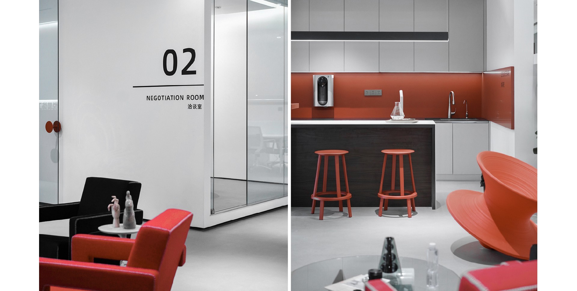 The office is dominated by white and red colors, creating a simple and stylish atmosphere. The overall layout is spacious and well lit, showcasing the openness and comfort of a modern office environment. Emphasize...